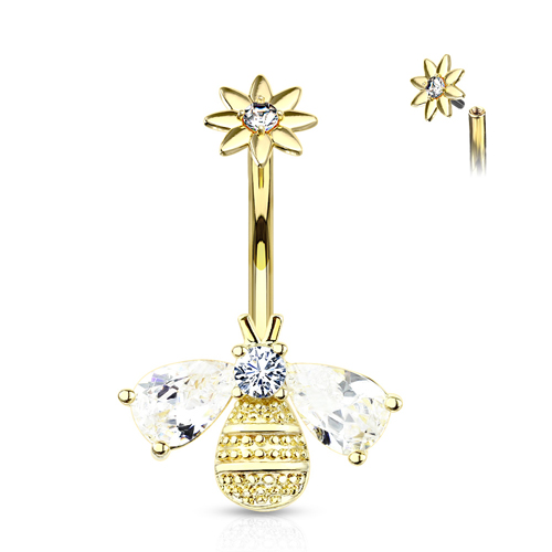 Bauchnabelpiercing mit Steinen in Flügel und Kopf mit Blumenspitze vergoldet